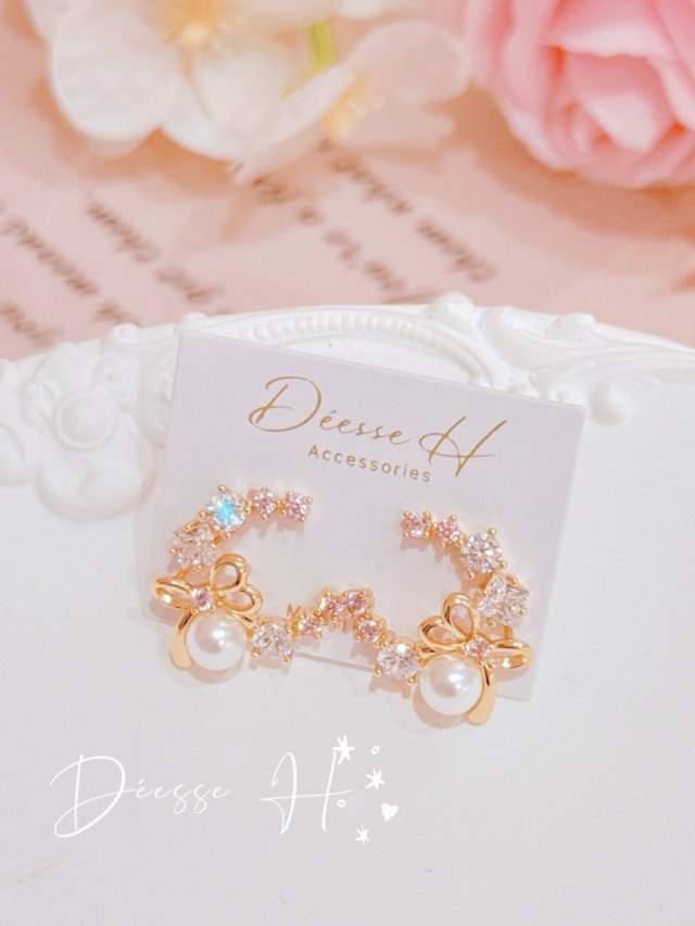 韓國粉晶月亮蝴蝶結耳環
